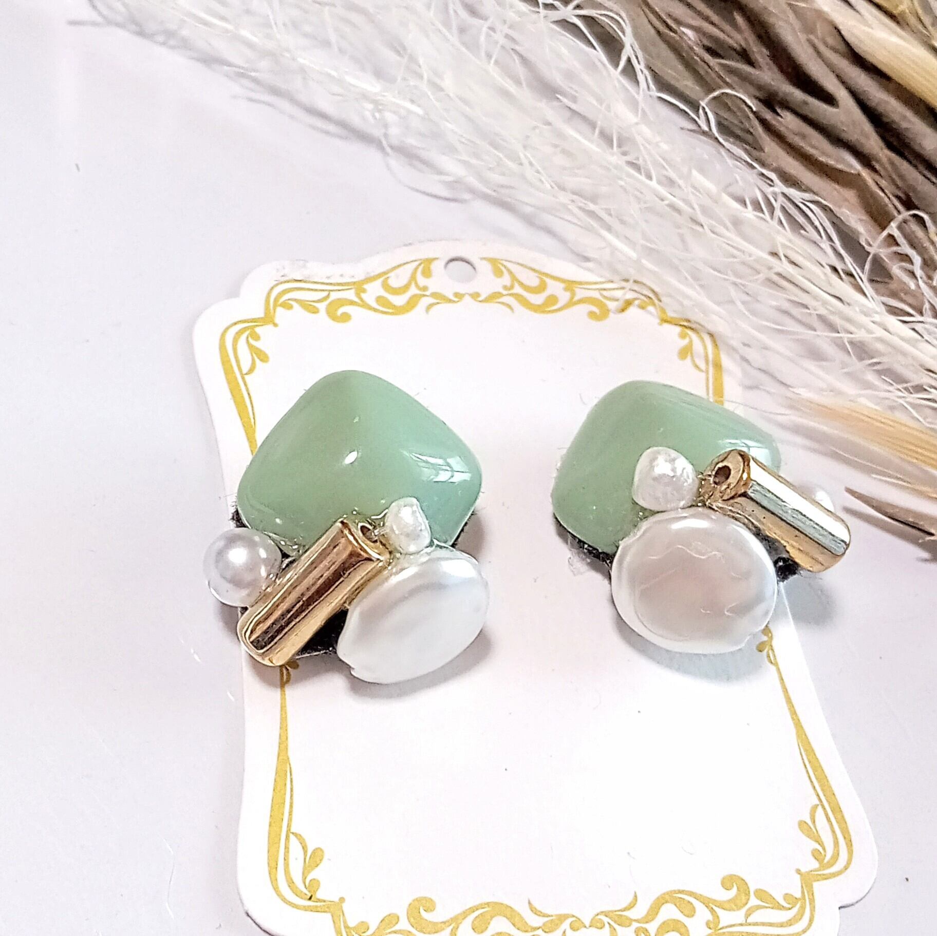 くすみカーキ色の カボション に 淡水シェルパールや ゴールドビーズ を接着して 個性的な